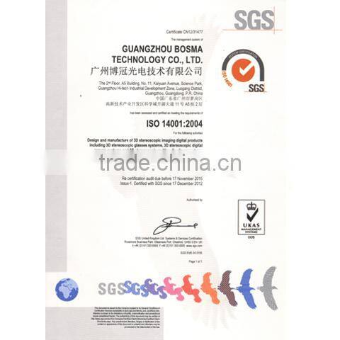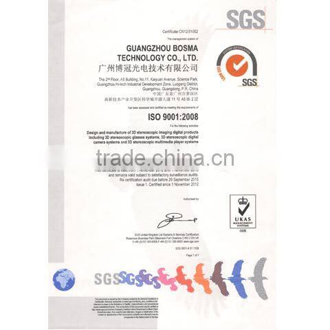 We are a leading 3D imaging solution provider and equipment manufacturer, with years of research in the fields of active shutter glasses, naked eye display, IR and wireless transmission, multi-view with wireless sound/voice integration, etc.; all products are manufactured strictly under ISO 9001:2008 & ISO 14001:2004 standards, and certified with CE, FCC, RoHS, REACH and PAHs by SGS.